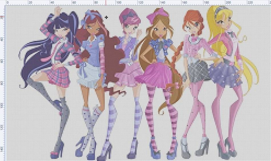 Нарисовать фею Винск очень сложно, даже по клеточкам.Яркая одежда и прическа имеют огромное разнообразие цветов, поэтому практически каждая клеточка имеет разный цвет.Тем не менее,