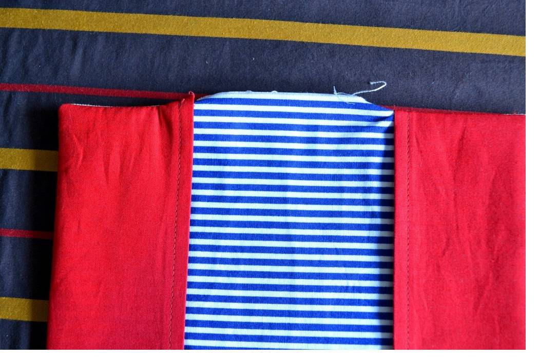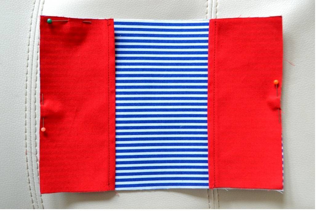 Сшейте 2 цветные части будущей обложки на швейной машинке аккуратным прямым швом.