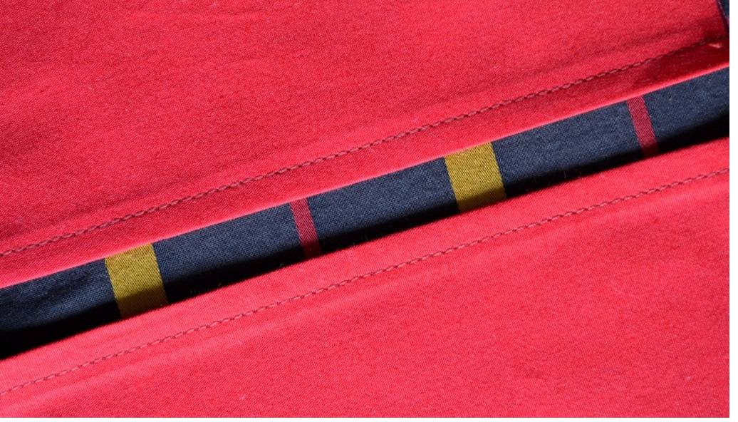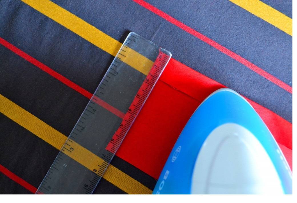Подогните оба прямоугольника изнаночной стороной внутрь на 5 мм по каждому краю периметра. Проутюжьте заготовки. Желательно, чтобы эти заготовки полностью совпадали по краям или лицевая сторона была чуточку больше (подгибать цветную ткань лучше на 3-4 мм, тогда будет легче ровно прострочить заготовки).