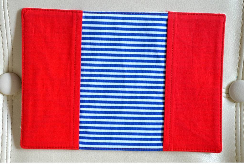 Оберните паспорт прямоугольной двойной тканью, подверните закрылки, в которые будет вдеваться документ. Зафиксируйте маленькими стежками свернутые закрылки.