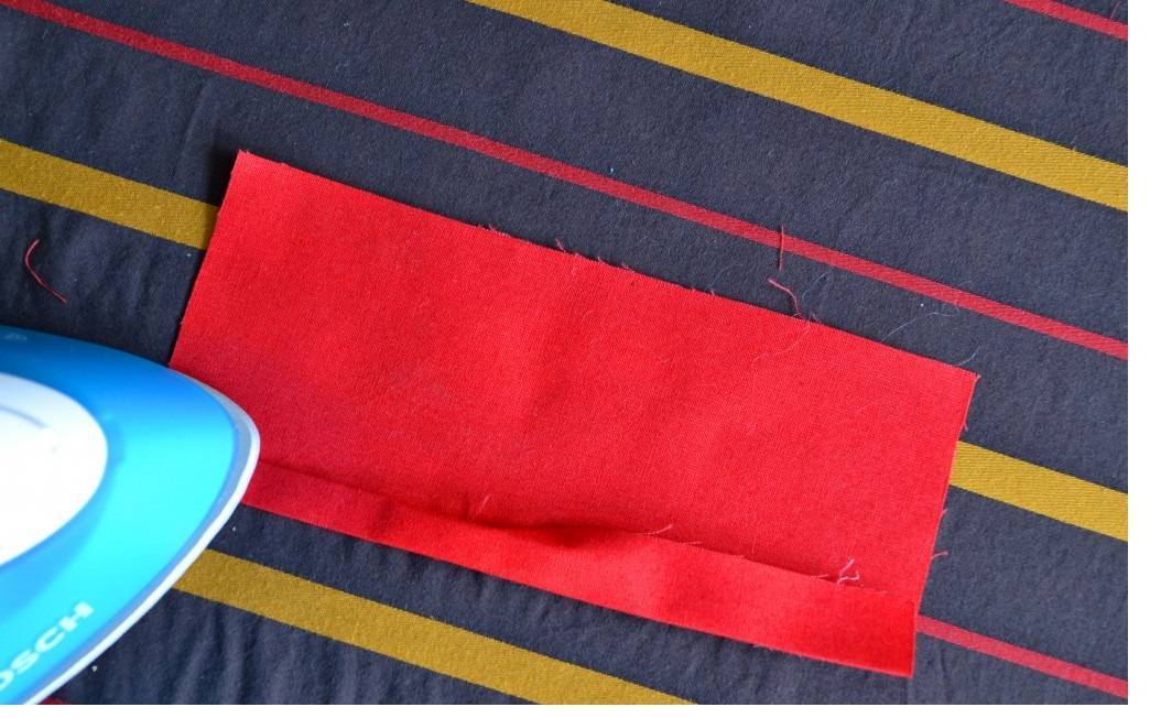 Из клетчатой ткани вырежьте прямоугольник длиной 13 см и шириной 5 см. Загните на 1 см и заутюжьте вовнутрь короткие стороны прямоугольника.
