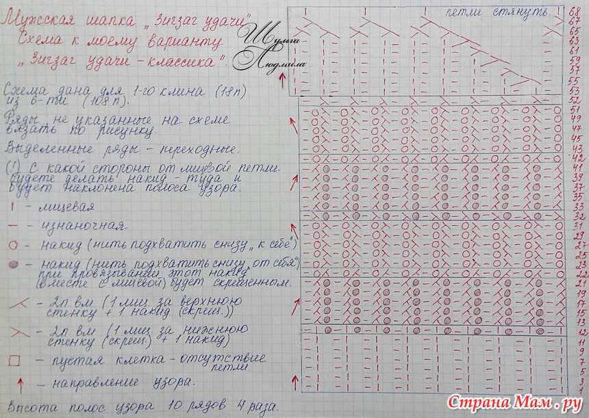 Может кому-то легче вязать по схемке. Покажу свои записи. Схема «Полуклассика» к шапке «Зигзаг удачи»: Рисунок показался очень лёгким, только старалась вязать его плотно. На фото покажу вам его с изнаночной стороны ( в оригинале это лицевая) – полосы ровные и плоские. Но я выбрала для лицевой стороны ту, где узор очень рельефный.