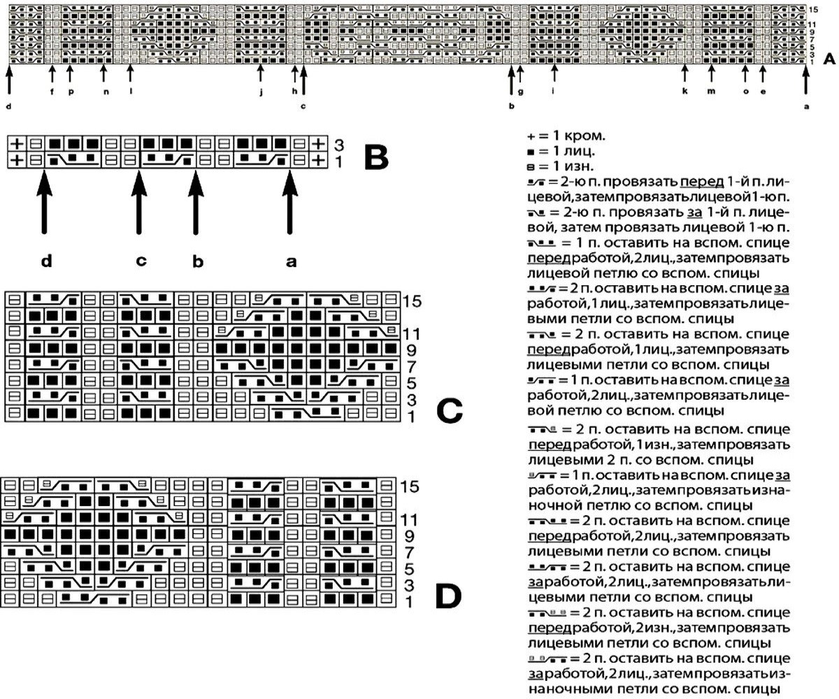 Исключая участки узоров А и В, всё изделие выполняется платочным рисунком.