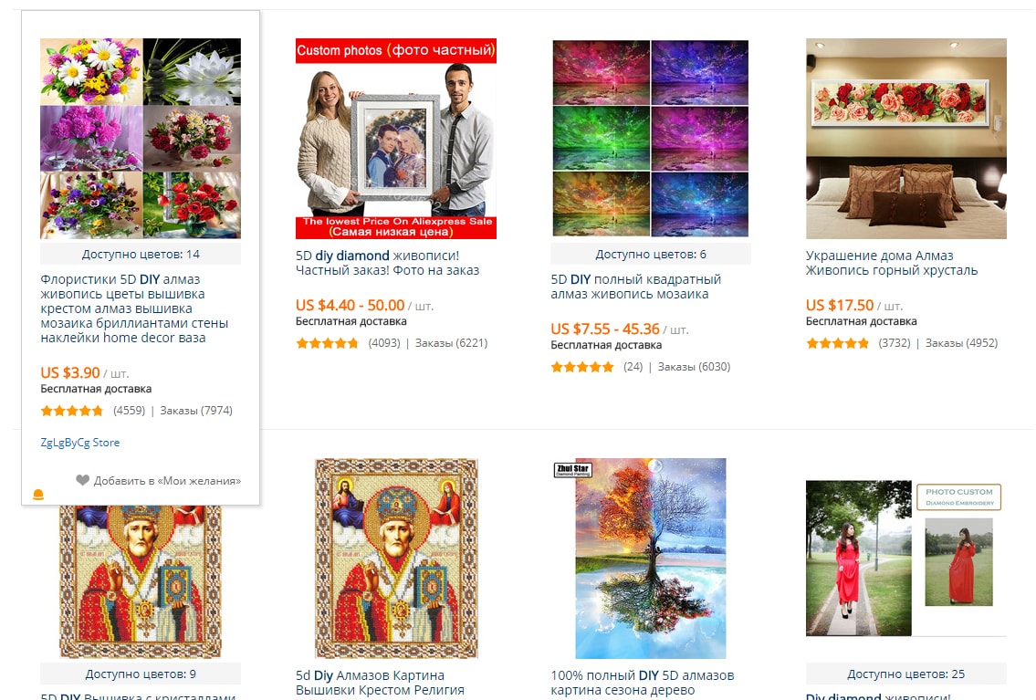Список продавцов алмазных вышивок на Алиэкспресс, качество товаров которых подтверждено хорошими отзывами: