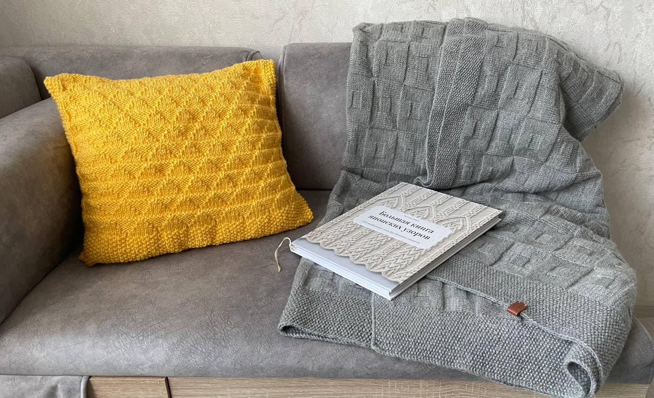- Связать полотно на двух спицах, стянуть или сшить по краям. Получится прямоугольная или овальная подушка.