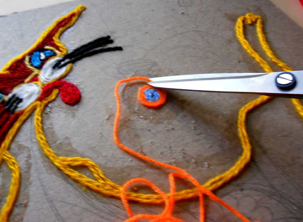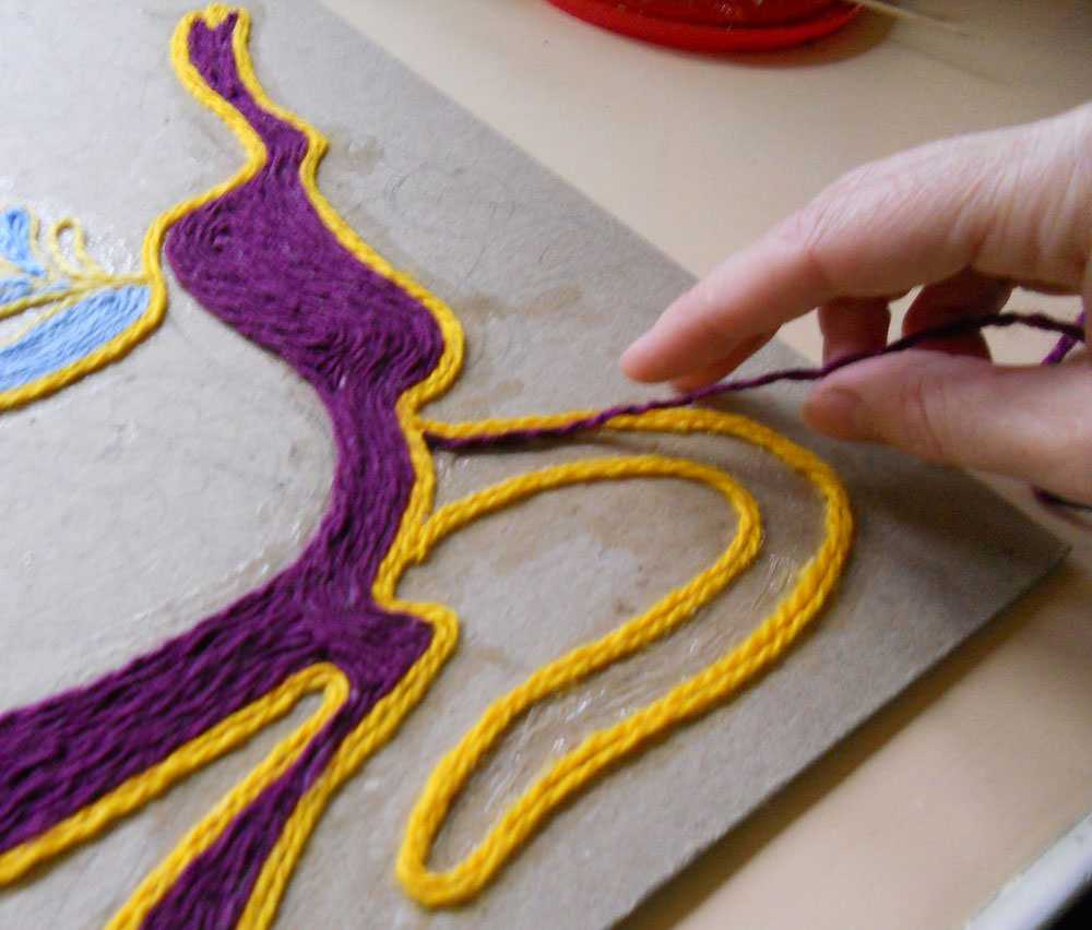 Прижимаем ее постепенно пальцами, раскладывая по рисунку. Конец нитки отрезаем ножницами после того, как доклеили до места, где требуется резкий невозможный поворот нити, или когда нужен другой цвет.
