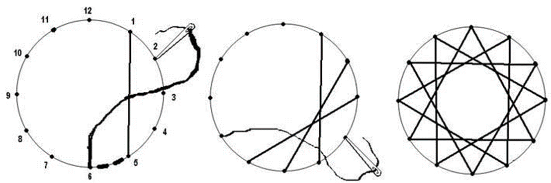 Важно! Вы можете соединять любые точки окружности в соответствие со своей (или чужой, если пользуетесь готовой схемой) задумкой, но так, чтобы расстояние между двумя соединяемыми точками всегда было меньше диаметра круга. То есть, на примере нашей картинки, нельзя соединять цифры 12 и 6, 3 и 9, 11 и 5, и т.п.
