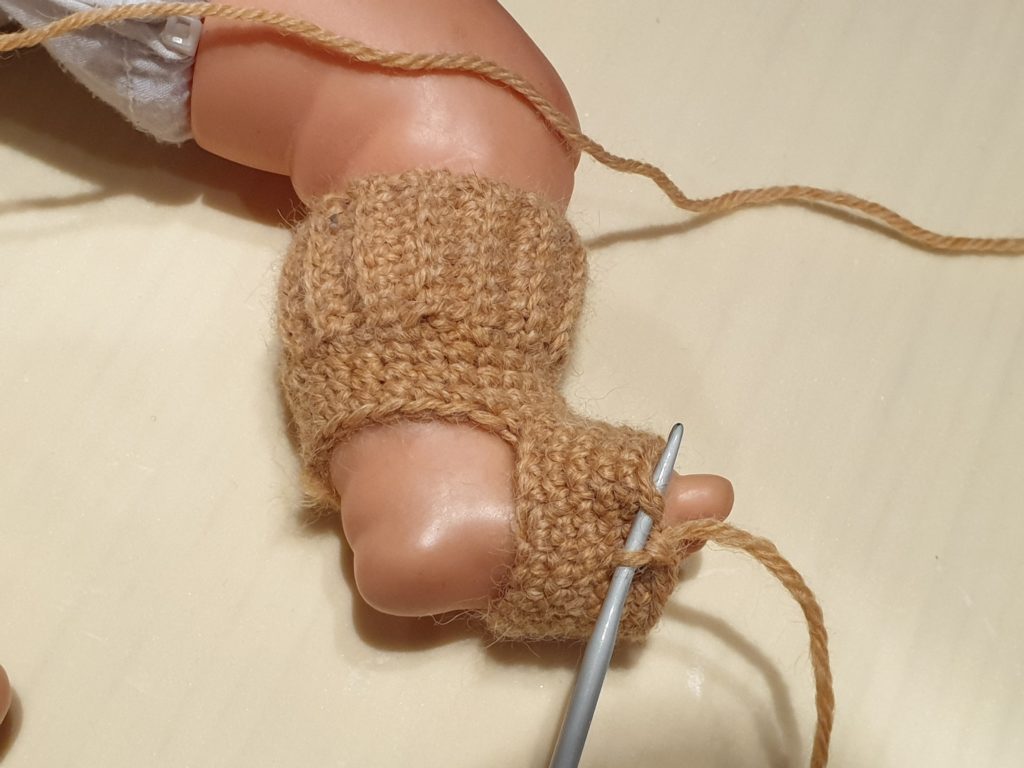 Переходим к пятке. Введите крючок с воздушной петлей в угол будущей пяточки носка, провяжите ряд по окружности. Далее действуйте по той же схеме и описанию, что приведены для мысочка. Готовое изделие выверните и примерьте обнову на ребенка.