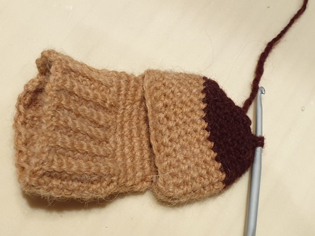- Пятку начать ниткой первого цвета: 1 воздушная петля, 12 столбцов без накида, повернуть вязание. Сделать еще 3 ряда. Низ пятки со стороны подошвы замкнуть соединительными столбцами.