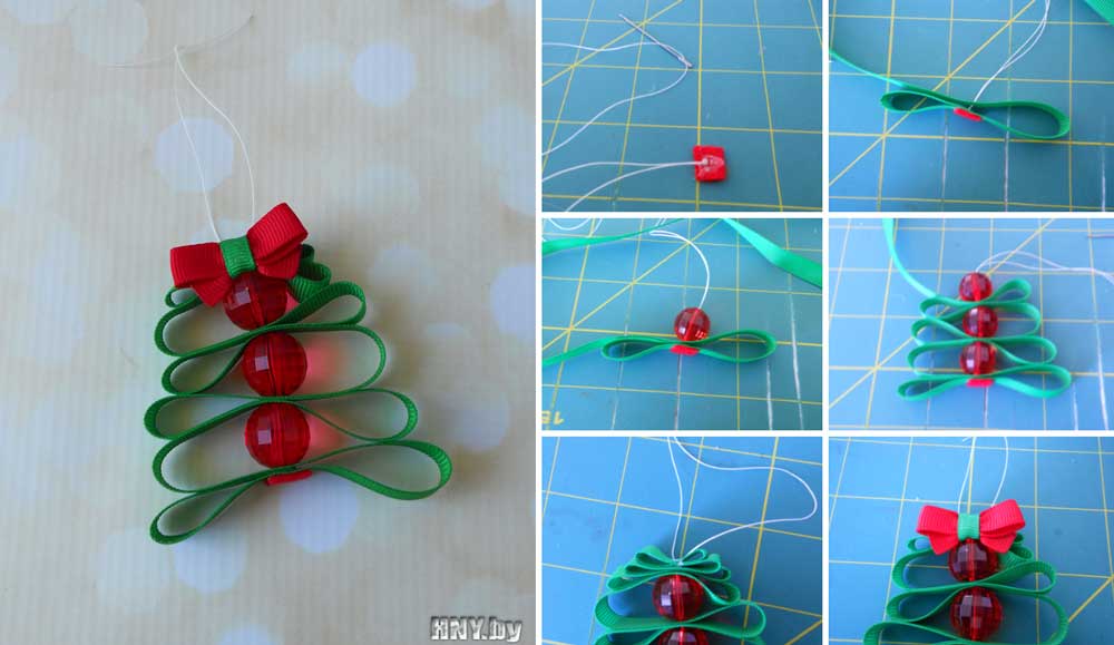Еще интересно получается елка из лент и бусин, которые поочередно необходимо нанизывать на нитку. Из этих же материалов изготавливают очень милые, маленькие броши, которые смогут символизировать праздник.