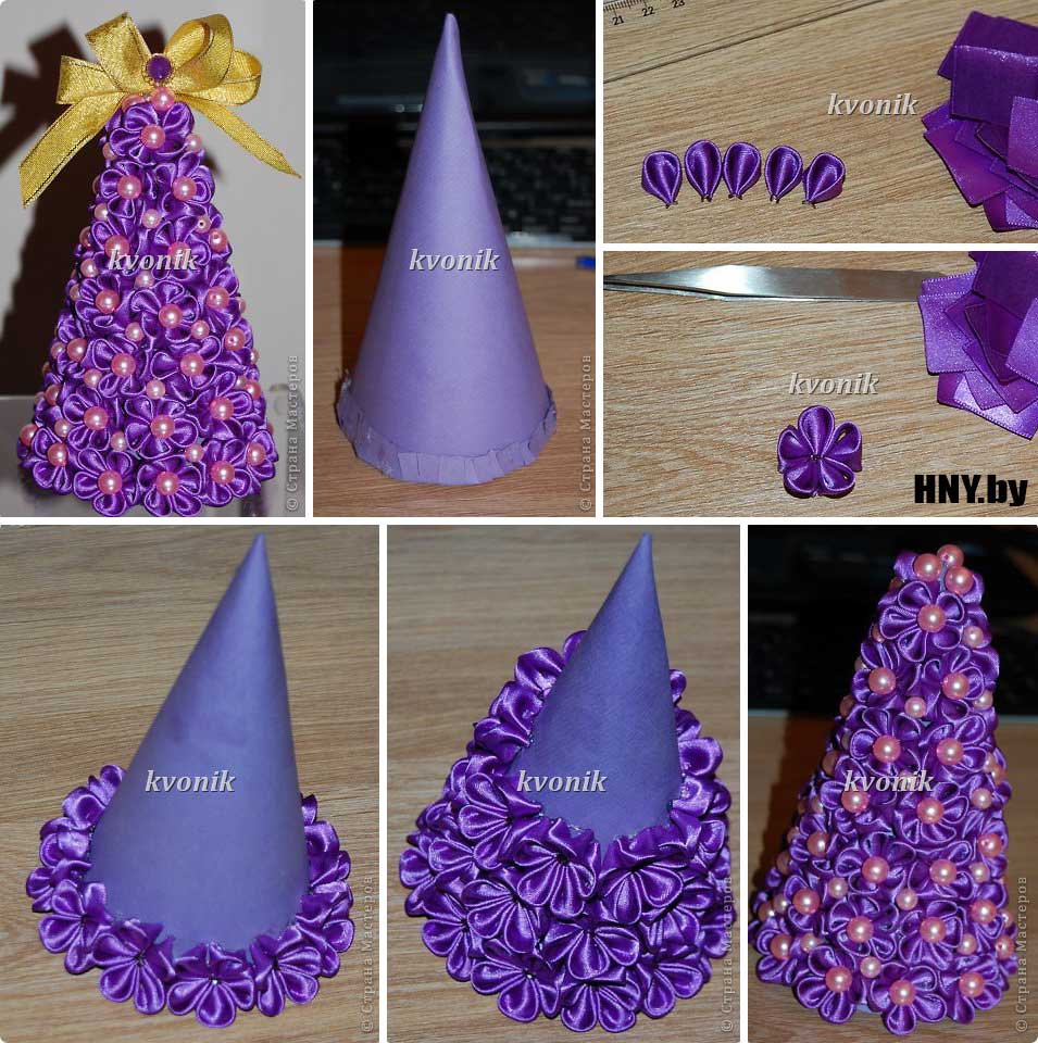 Елка из лент также станет украшением новогоднего праздника или отличным подарком родным или близким людям. Делать поделку просто. Например, возьмите конус из картона или пенопласта и оклейте разноцветными лентами. Кстати, для пенопластового конуса вместо клея можно использовать английские булавки.