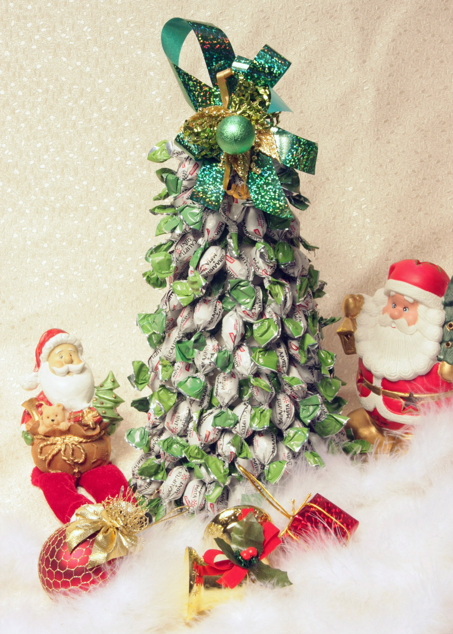 Такую елку легко украсить пушистыми помпонами, гирляндами из бус, стразами.