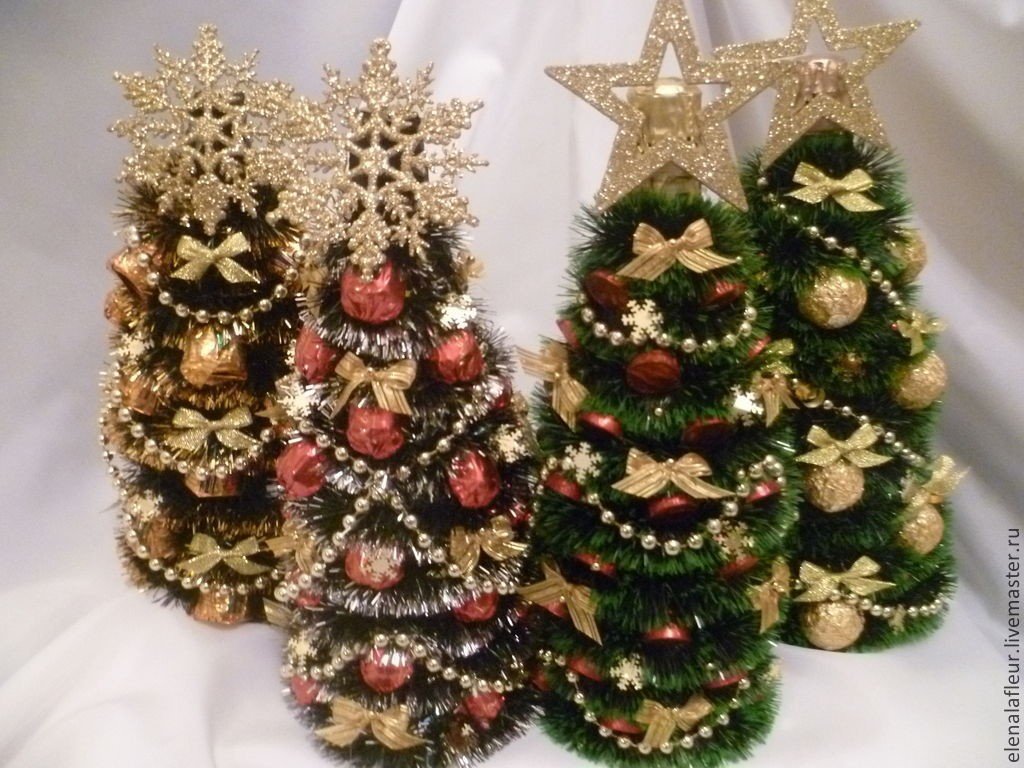 - Сверху ель украшается звездой, снизу закрепляется в подставке.
