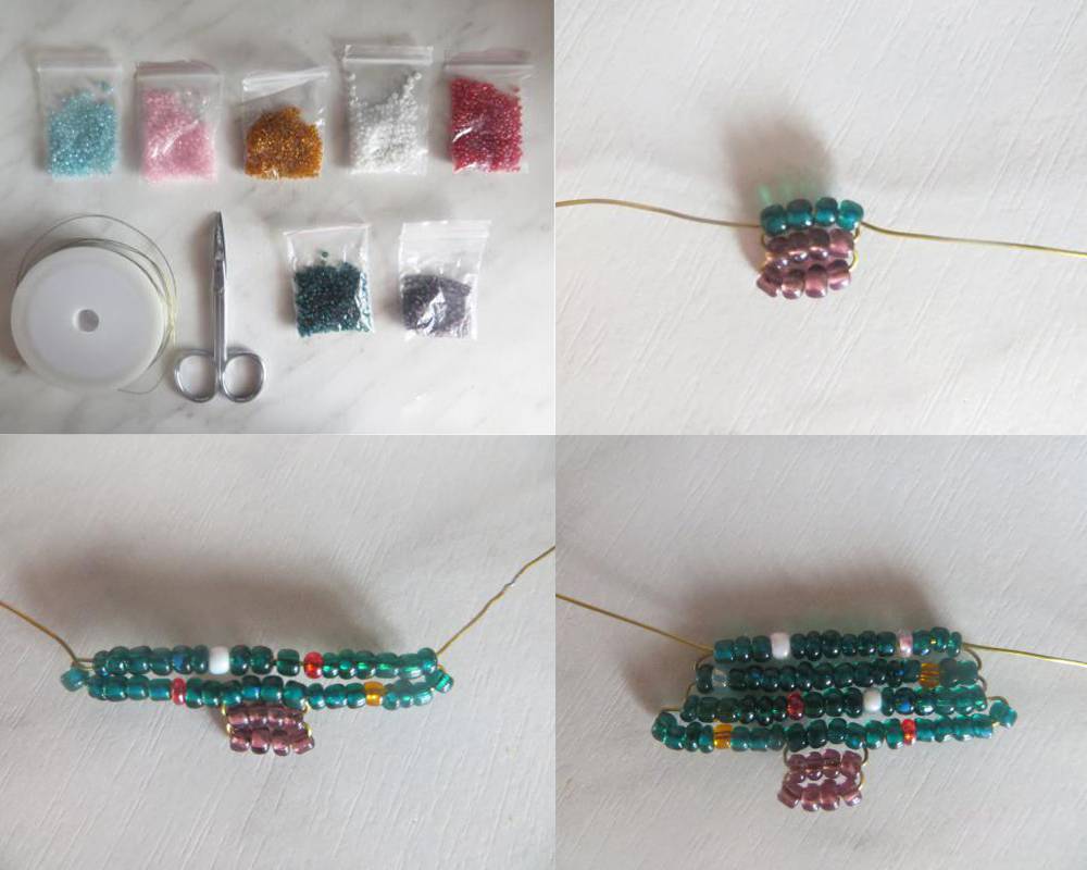 - Тем самым образом сплетите 4 зеленых бисерины в третьем ряду. А после через каждый конец проволоки проденьте по 7 бисерин, это завершение 3-го ряда.