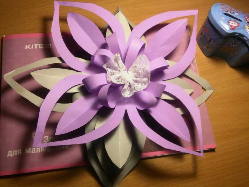 Лист складывают гармошкой, перевязывают ниткой посередине, делают маленькие продолговатые вырезы по сгибу с двух сторон и по краям. Затем потуже затягивают нитку в узелок. Расправляют бумажную гармошку.