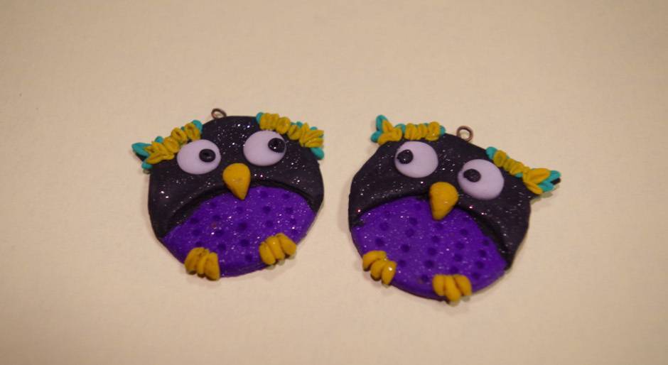 Совушек Ира украсила игривыми бровками. Она брала маленькие глиняные шарики и прижимала их иголочкой, а получались очень натуралистичные перышки!
