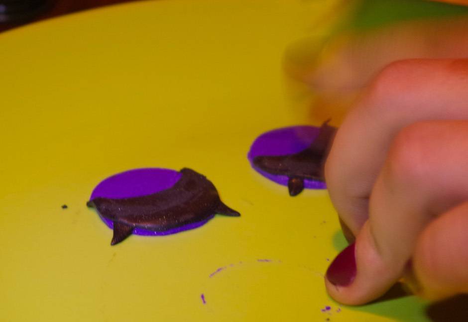 Отделите заготовку от Марблса при помощи лезвия. Подошел момент сборки пирожного. Между двумя элементами одного оттенка положите белый кружочек. Должен получиться трехслойный «макарун».