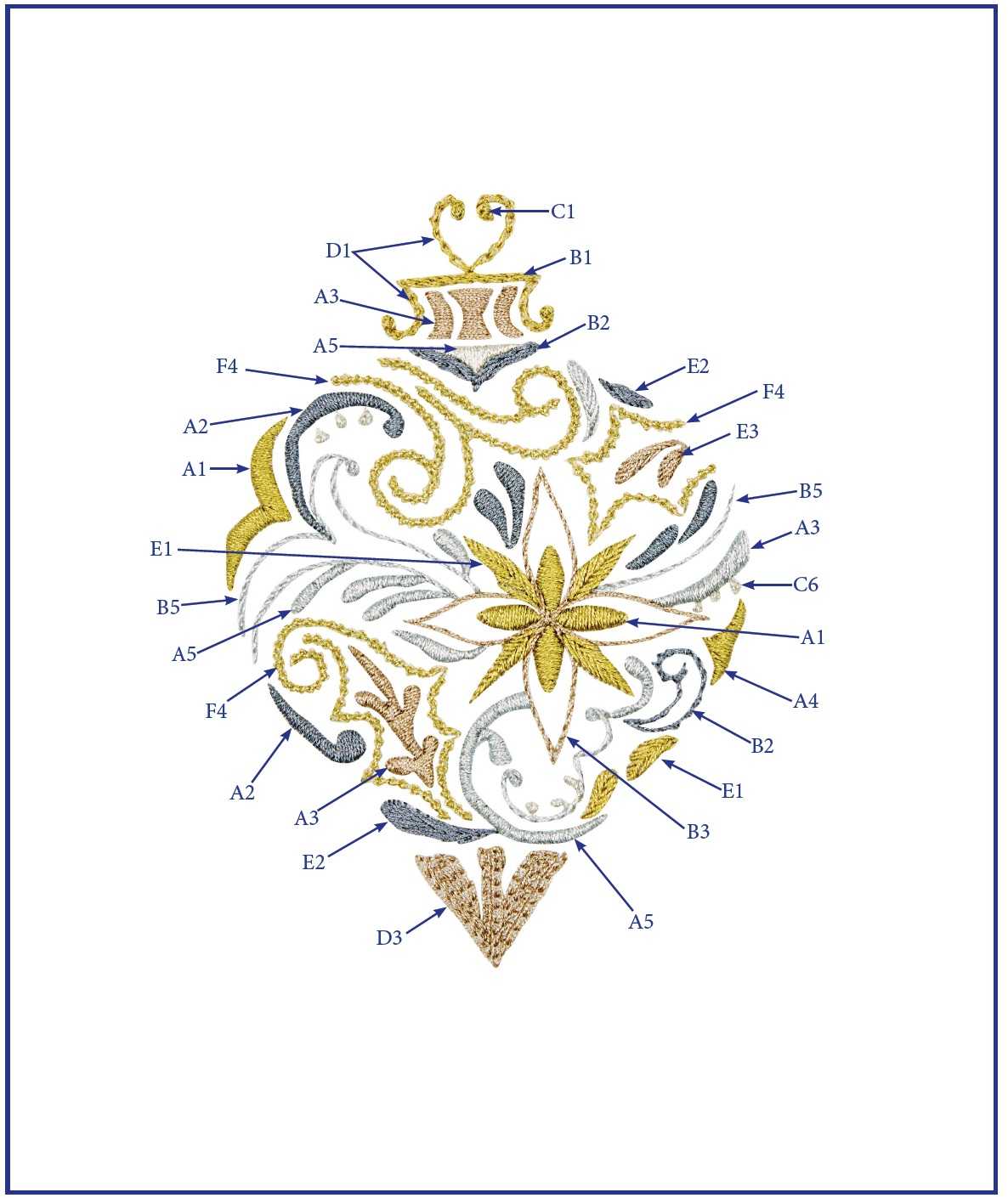 Мотив состоит из нескольких видов вышивальных стежков, их виды указаны буквенно-цифровыми кодами на схеме.