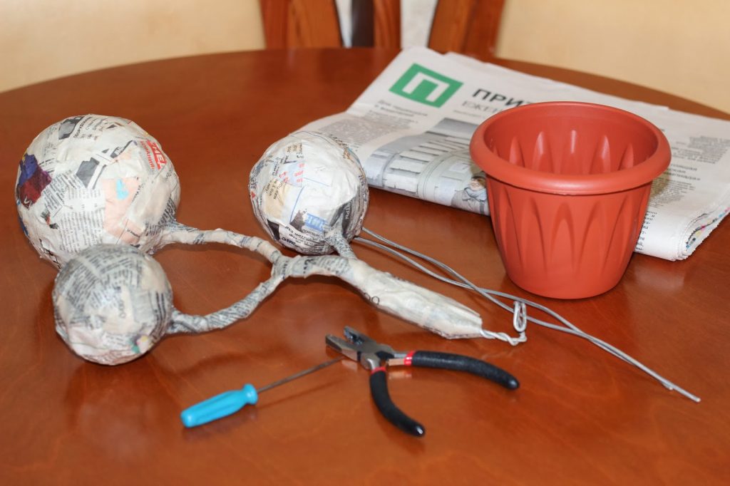 - Папье-маше. Из него чаще всего изготавливаются кроны нестандартной формы (сердечки, абстракция, конусы и другие геометрические фигуры). Заранее подготовить бумагу и клей, поочередно клеить слой за слоем. Следить за тем, чтобы они хорошо просыхали.