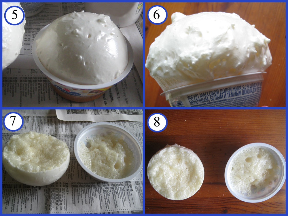 - Монтажная пена. Две пластиковые формы заполнить пеной, дать высохнуть, после чего снять их. Склеить половинки, обрезать округло.