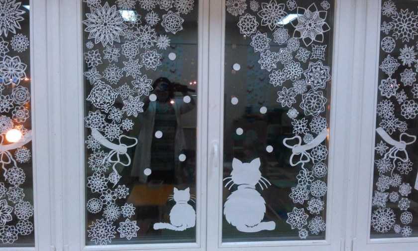 - Расписание стекол гуашью посредством трафаретов по ранее продуманному сюжету. После праздника рисунки легко удаляются водой. Забавный вариант – силуэт на стекле снеговика, а иллюстрация оленя – настоящий новогодний атрибут.
