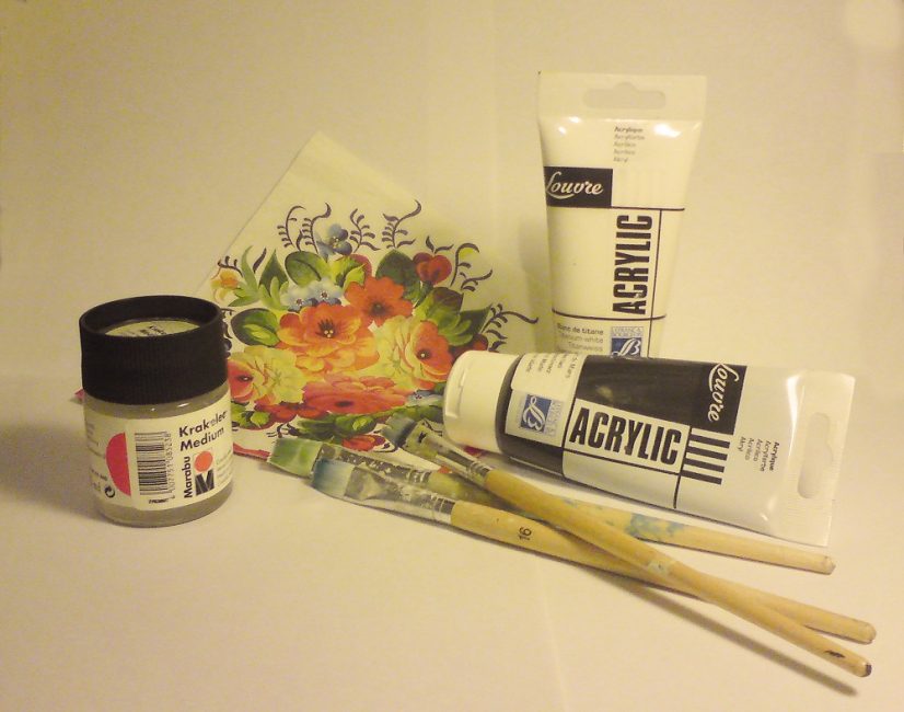 - Белая акриловая краска. Её также можно купить в отделе стройматериалов. Она обойдётся намного дешевле, чем профессиональный акрил для декупажа.