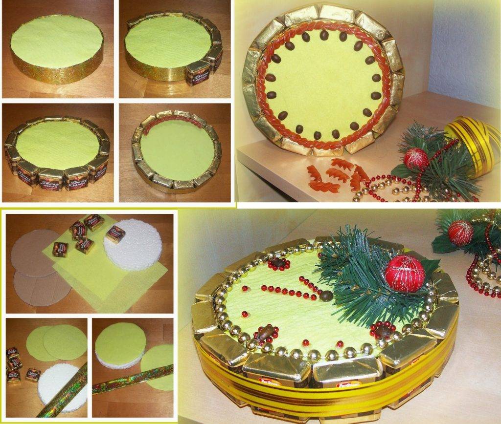 Итак, с цветом нашего сувенира мы определились, начинаем делать новогодние подарки из конфет своими руками.