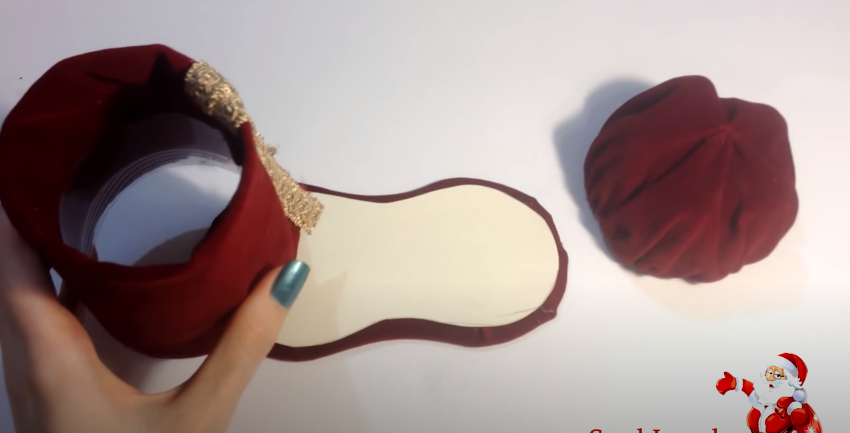 - Нос сапожка делаем из дна бутылки. Обтягиваем ее красной тканью и пришиваем ее, затягивая в виде мешочка.