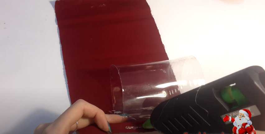 - Закрываем полностью пластиковый цилиндр тканью с помощью клея. Когда будете подгибать нижний край и приклеивать его к бутылке, оставьте не приклеенными края, примерно по 5 сантиметров с каждого края.