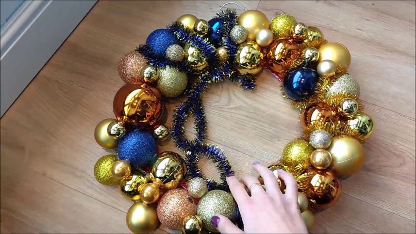 Когда-то давно праздничные венки украшали зимними яблоками. Теперь в этой роли часто используют шары другие ёлочные игрушки. Способ изготовления венка из новогодних игрушек тот же: прикрепите игрушки к каркасу с помощью клея, ниток или проволоки.