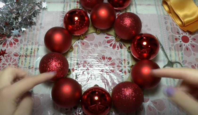 Из шаров убирают крепления с ниткой. Клеевым пистолетом фиксируют игрушки по кругу вплотную, чтобы не видно было пустых мест. Если такие участки имеются, то их закрывают бусинками.