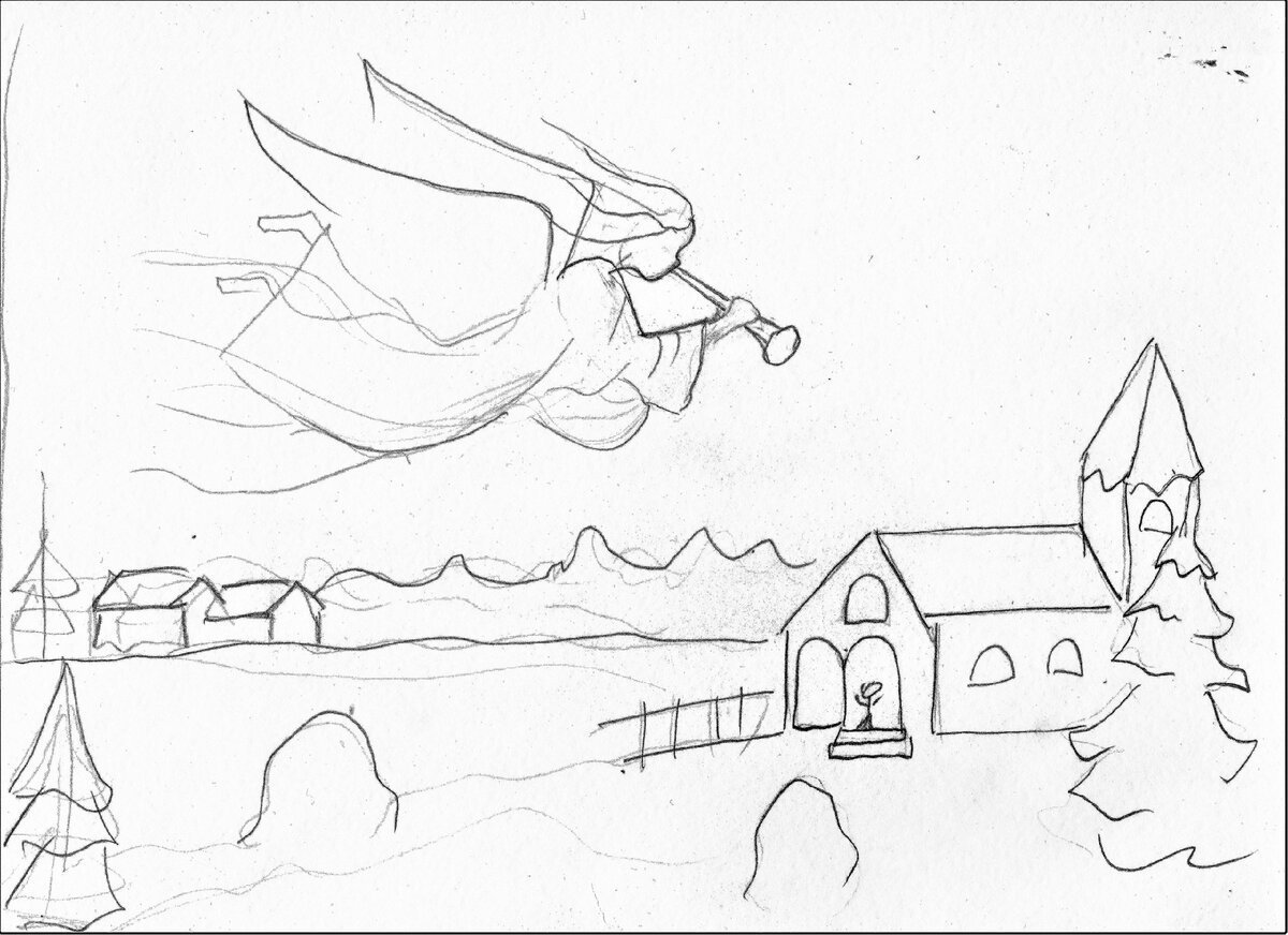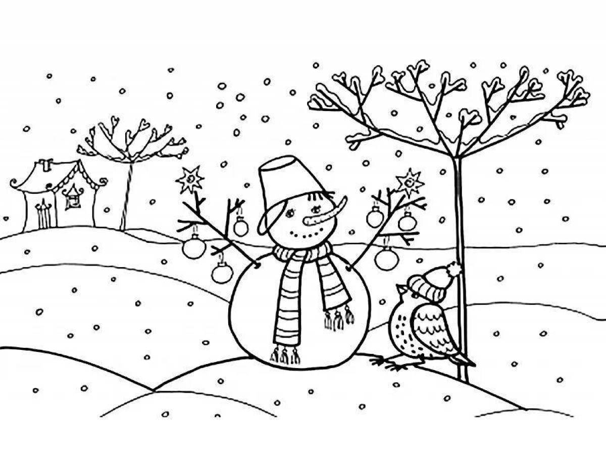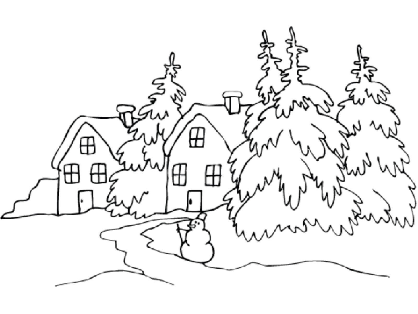 Ничего нового. Совмещаем элементы из ранних работ: тут и домик, и елки, и снеговик. Такой вариант подходит и для детей 2 и 3 класса.