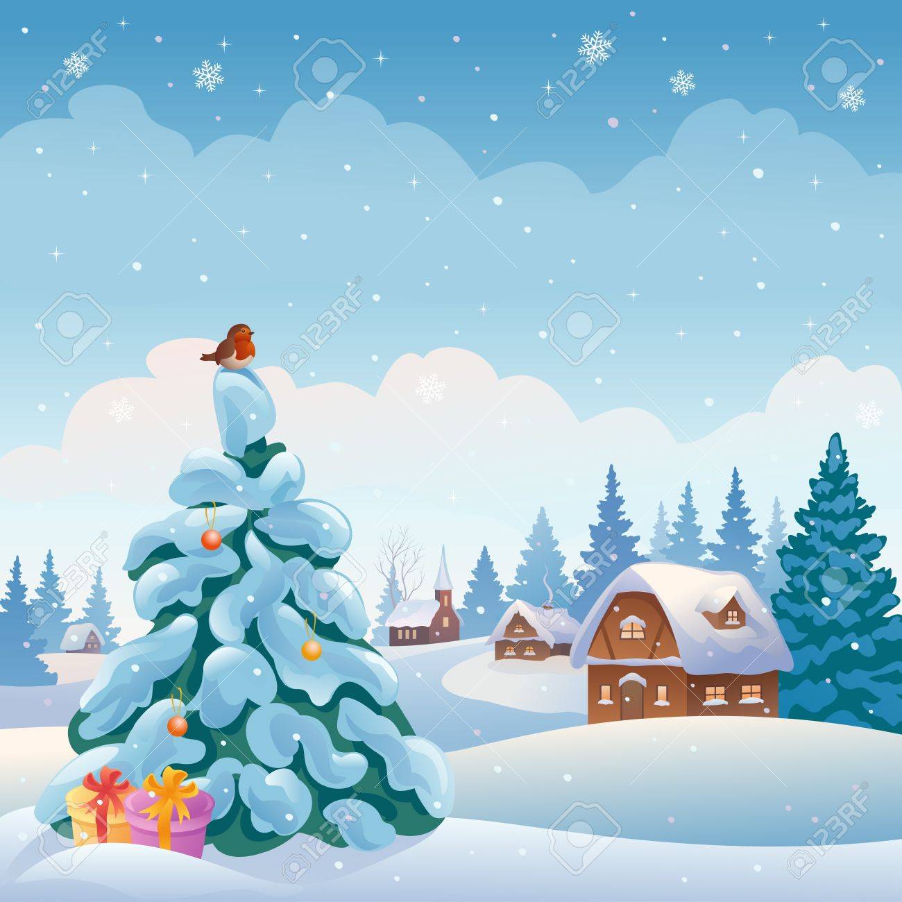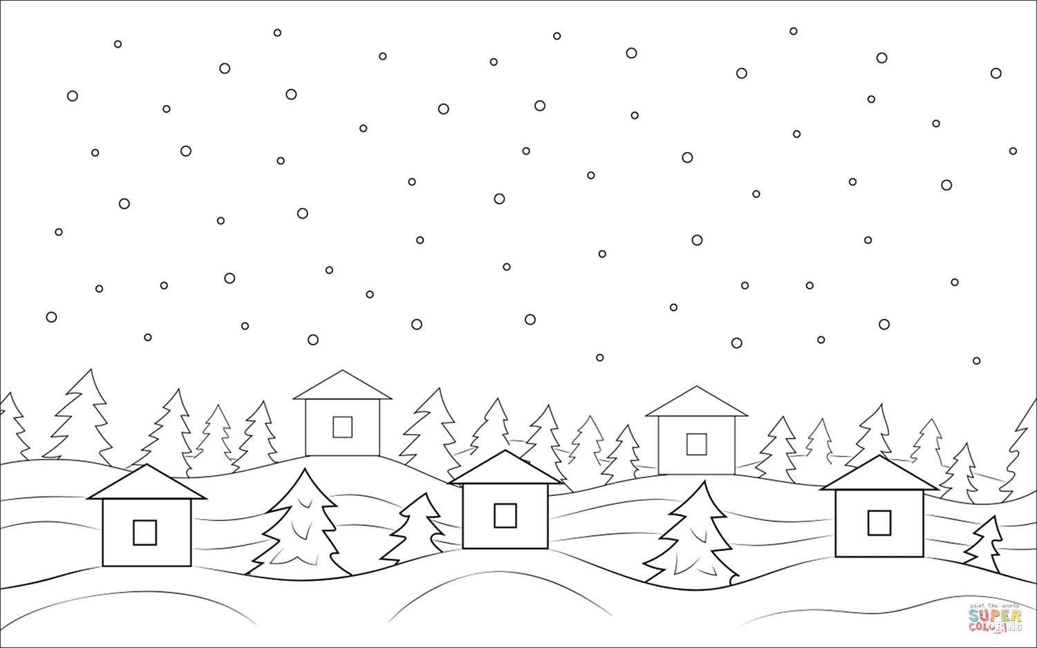 Для начала нарисуйте три больших сугроба, один за другим. На них изобразите елочки. Для этого коричневым карандашом прочертите одну палочку. От нее будут отходить веточки. На них зеленым цветом нарисуйте иголки. Белым карандашом изобразите снег. За сугробами будет прятаться дом. Нарисуйте квадрат, а сверху него треугольник. Это стена с крышей. На стену поместите маленький квадрат и рядом с ним прямоугольник: окно с дверью. Белым или голубым цветом присыпьте крышу снегом. Готово.