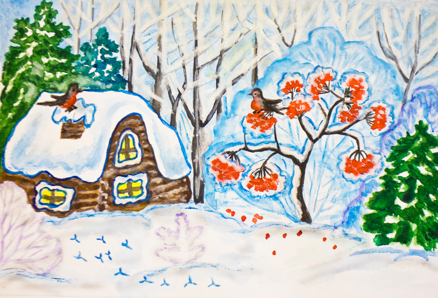 Представляем вариации детских рисунков на тему «Зима» с цветными карандашами и красками. Одна из них: