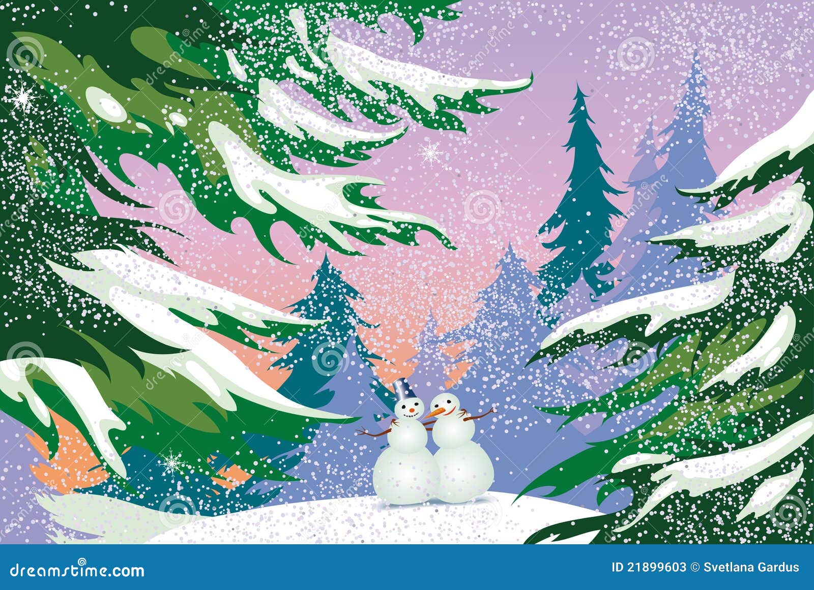Поэтому, предлагаем на заднем плане изобразить елки, а на переднем улыбающегося снеговика и его подружку-мышку: