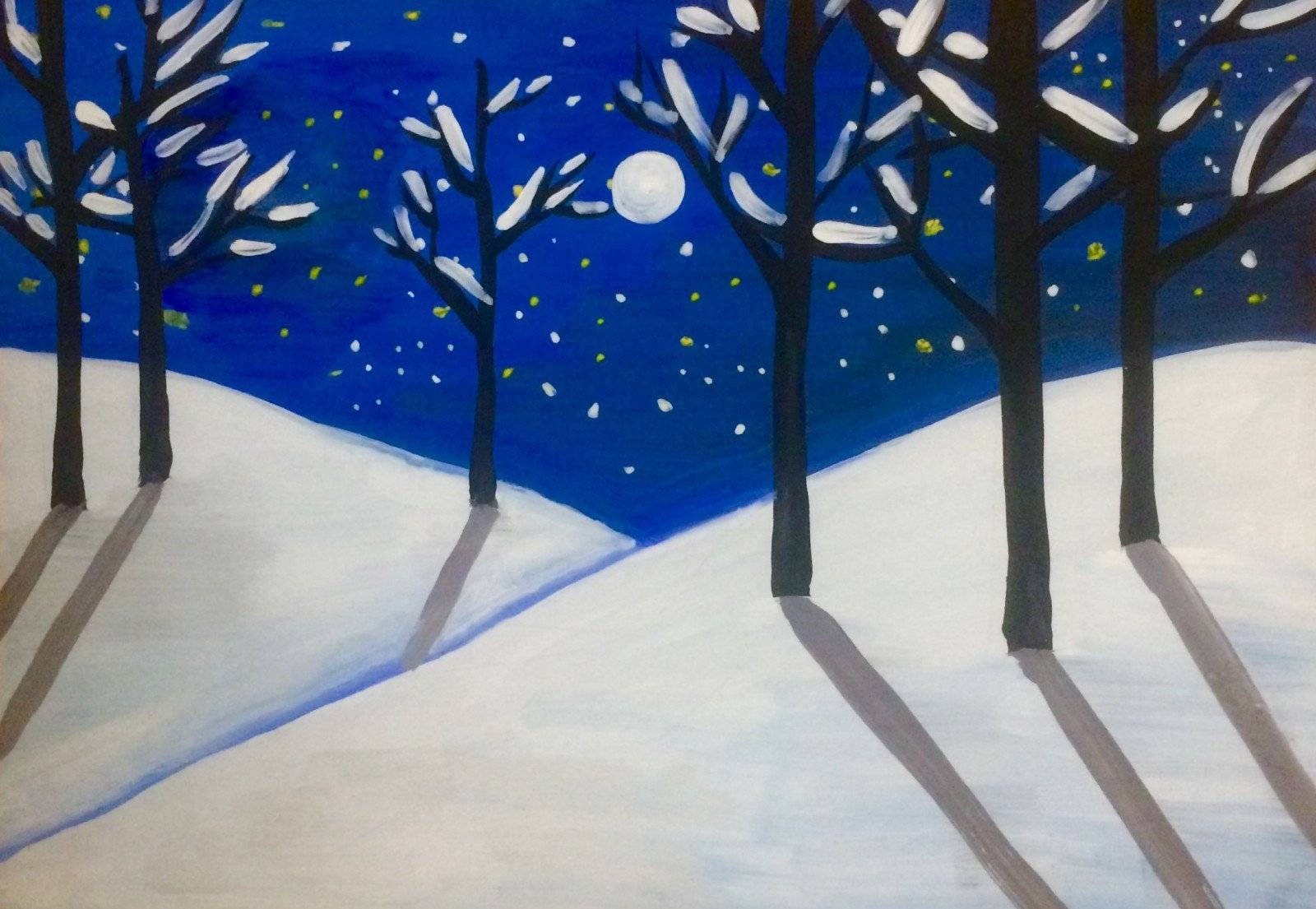 Даже если вы будете работать в стиле минимализма, есть шанс добиться нужной узнаваемости. Припечатайте зеленым цветом елку как в пункте выше. Поверх этого слоя нанесите почти такой же, но белый, оставляя место для предыдущего. Получается елка, которую запорошило снегом. На небо добавляем синюю краску, на ней тонкой кисточкой прорисовываем звезды и снежинки.