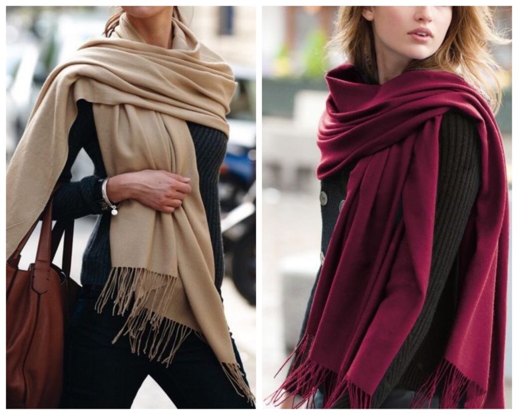 - идеальный вариант для теплого пальто или дубленки зимой — палантин из кашемировой ткани;