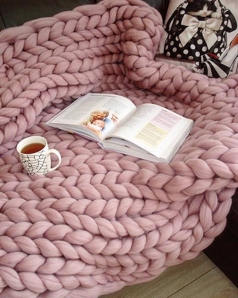 Как связать плед, одеяло, покрывало из толстой пряжи, шерсти альпака и мериноса, крупной объемной вязки на руках без спиц и крючка: пошаговая инструкция