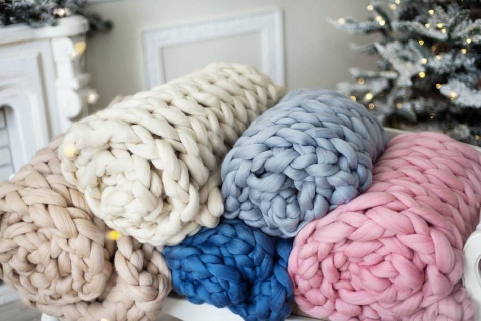 Из шерсти мериноса удаются пышные и легкие вещи на крупных спицах. Если работать крючком, полотно выйдет частым. Такое решение сгодится для ковриков и подстилок, но одеяла и покрывала стоит делать более рыхлыми и мягкими.