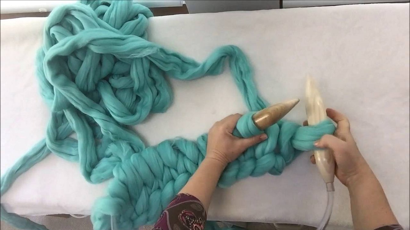 Если у вас нет дома больших спиц, то вы легко можете заменить их трубами из ПВХ или же руками. Такой крупной и необычной пряжей мериноса можно вязать даже на руках, а не спицами.