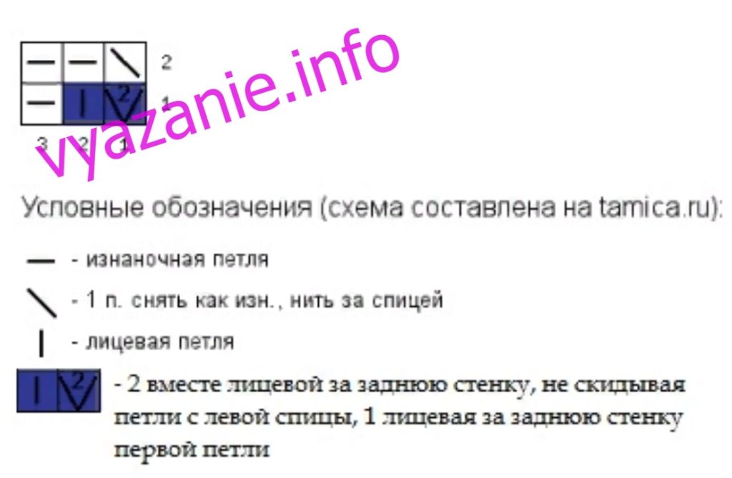 - 2 р. провязать 1 лиц. п. лицевой, накид, снять изн. п. без провязывания, выполнять до края ряда;