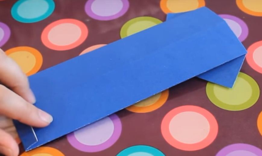Сгибаем лист синей бумаги пополам (вдоль более длинной стороны).Разворачиваем и заново слаживаем каждый край к середине, как делали в первом варианте открытки сердца. Далее отгибаем два края в виде воротничка.