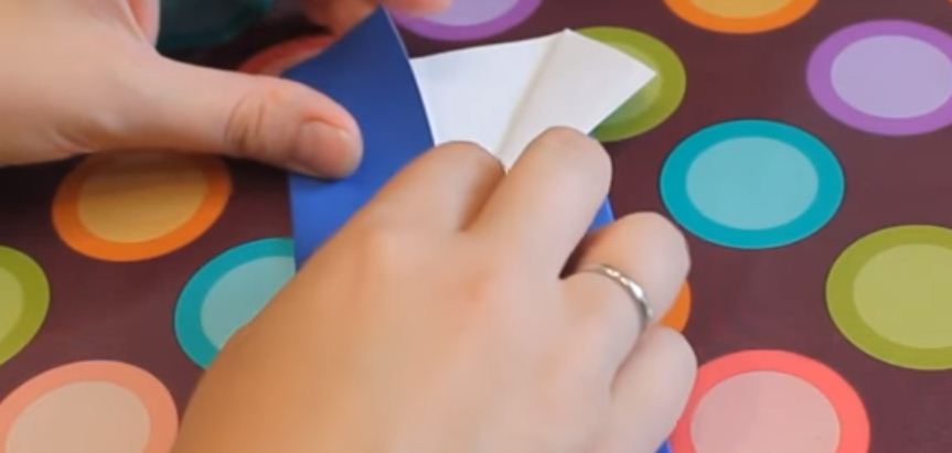Находим середину, сложив и расправив треугольник пополам. Соединяем края треугольника внизу.