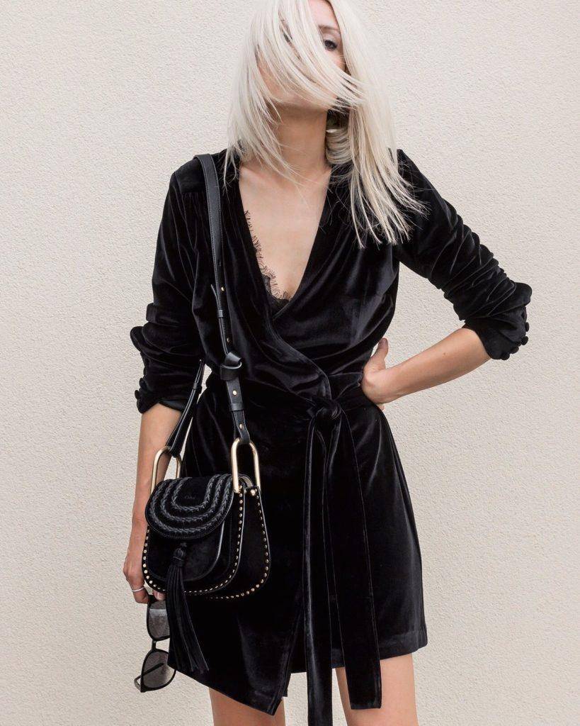 Наряд сшитый из бархата смотрится дорого и изыскано. А чёрное платье выполнение из такого материала будет обладать особым шиком. Но стоит заметить, что бархат слегка блестит, поэтому может визуально придать ненужного объема пышным формам. Поэтому крупным женщинам стоит отказаться от таких платьев. Идеальным дополнением к бархатному платью будут аккуратные жемчужные украшения.