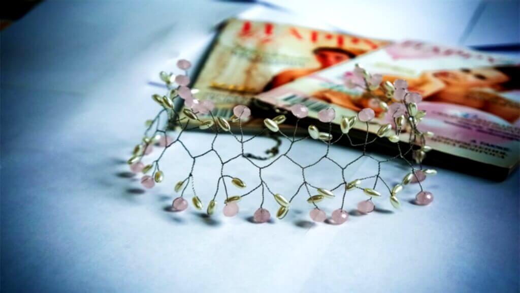 Такой аксессуар можно сделать для невесты или для фотосессии. Для этого аксессуара нужны только белый бисер и проволока 0,2-0,3 мм. для бисероплетения. Ещё нужны будут белые и розовые бусины. Бусины, по возможности, возьмите полегче, например – пластмассовые. Нам не нужно, чтобы веточка была тяжёлой, будет некомфортно голове.