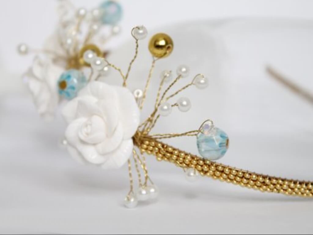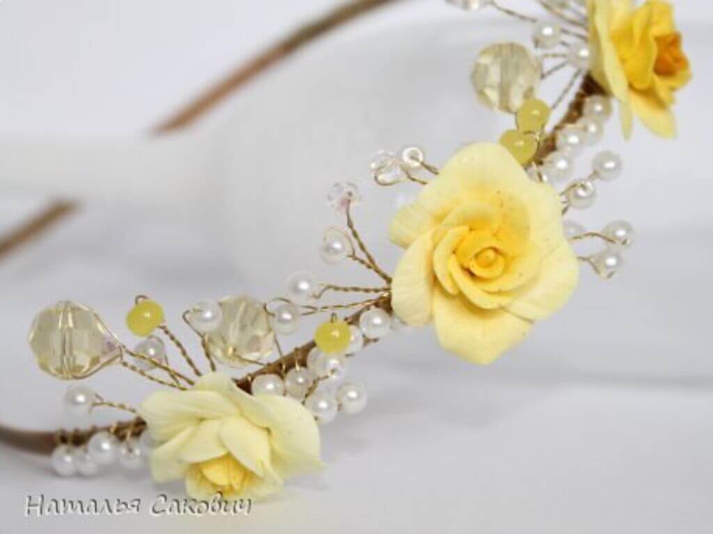 Такой ободок с белым бисером вполне можно сделать и на свадьбу. Здесь оплетается проволокой с бисером сам тонкий ободок. Украшен бусинами и розами из полимерной глины.