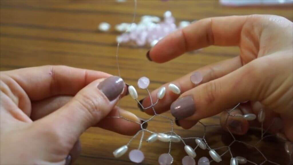 В тот момент, когда вы дойдёте больше чем до середины вашей работы, начните выкладывать веточки с другого конца аксессуара. Затем плавно соедините весь металлический узор. За счёт того, что проволока хорошо гнётся, этот процесс не составит особого труда. Лишнюю проволоку необходимо подрезать, а последние ветки плотно закрепить.
