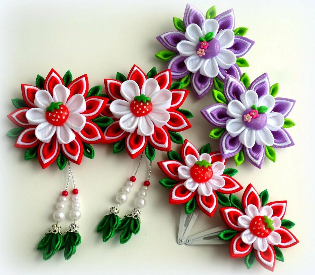 Прекрасные цветы, выполненные из лент в технике канзаши, могут стать основой эксклюзивных аксессуаров. Чаще всего это заколочки для волос (резинки, шпильки, ободки, повязки, зажимы, гребни и прочее). Кроме того, взяв за основу детали из ткани и ленточек, можно создавать всевозможные сувениры и декоративные элементы для поясов, бижутерии, сумочек, шкатулок, косметичек, кошельков, шляп, обуви и так далее.
