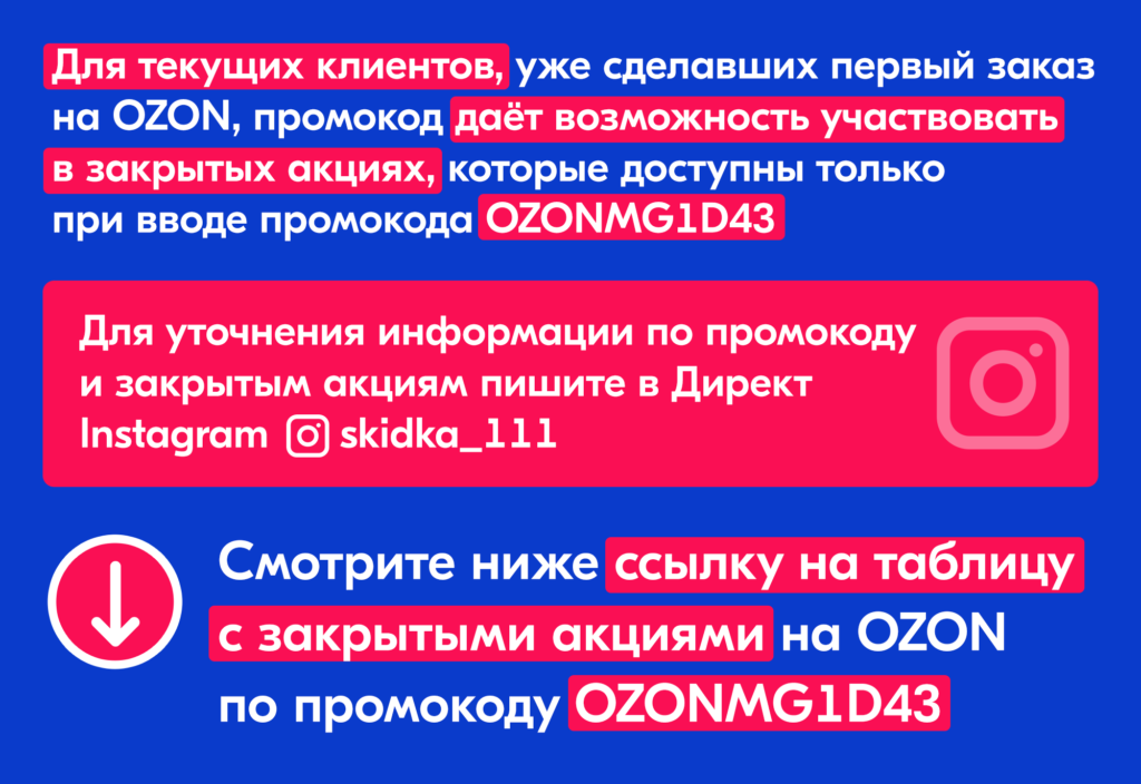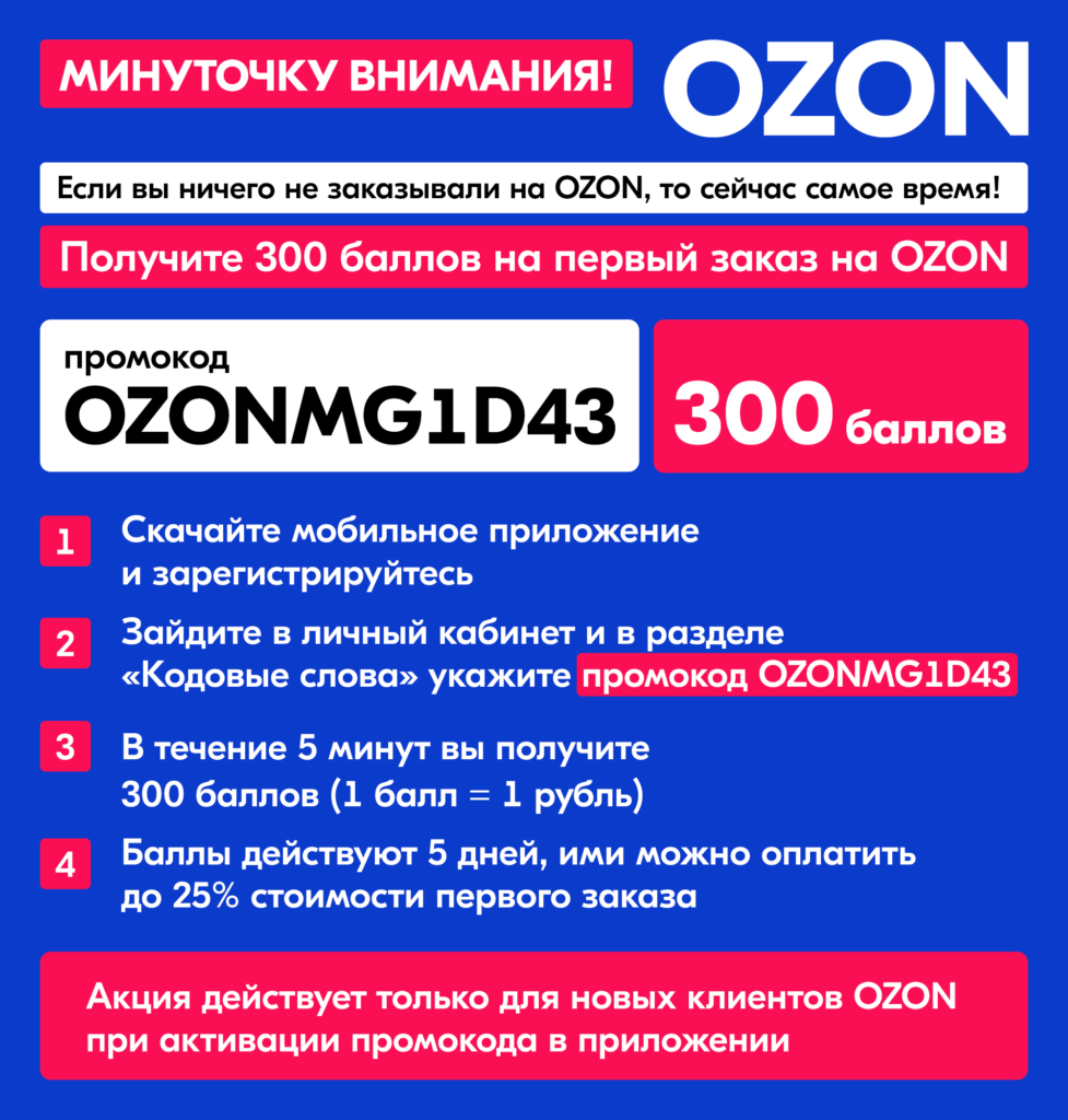 Используйте реферальный промокод OZONMG1D43 вашего персонального Менеджера , чтобы получить 300 баллов на первый заказ или доступ к закрытым предложениям.