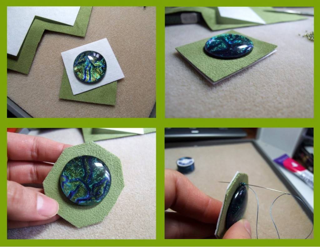 - В начале аккуратно прикрепите кабошон к фетру с помощью клея. Не вырезайте.